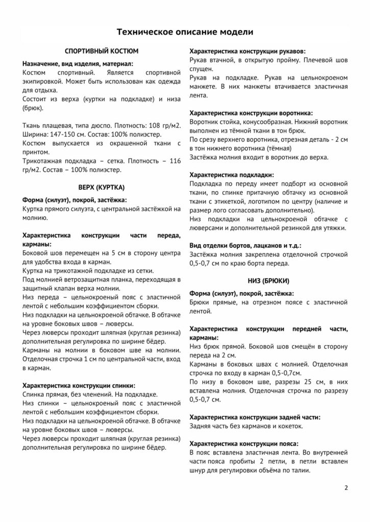 - Техническое описание модели одежды: это детализированная информация о конструкции и деталях модели, используемых материалах и особенностях производства.