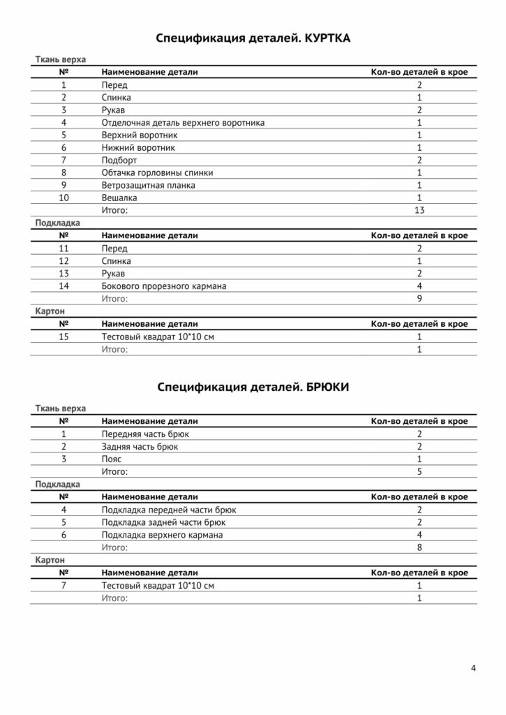 - Спецификация деталей в крое: включает полный список всех деталей кроя, их количество в изделии, а также назначение материала для каждой детали.